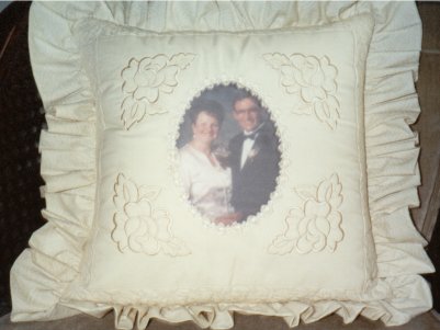 This pillow is for my Aunt & Uncle's 40th anniversary. The flowers are from Elsa Goussard's Tone on Tone Collection. I printed their photo onto fabric. I digitized the the oval opening. When you turn it, it makes a perfect oval frame. I sewed trim over the opening. Sometimes I do, sometimes I don't. If you want to download the oval and instructions, click here.