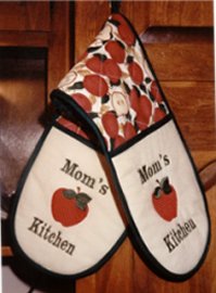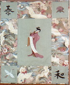 I made this wallhanging with Emnet's Geisha design. It was split with This is a double oven mitt. The apple design was downloaded somewhere off the Atomizer. The crane is Cactus-Punch, other designs Ann the Gran. net. I added the lettering.