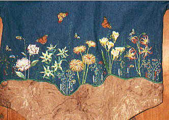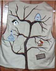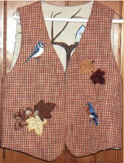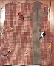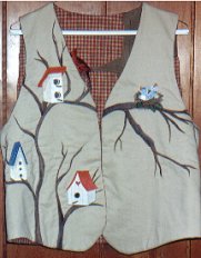 I made this vest, after I saw one by Lindee Goodall, of Cactus-Punch. I made my vest reversible. The tree on the back is appliquéd. The birds are from The tree is painted on, then the birdhouses are embroidered. Balboa. The leaf designs are from Pea Patch.