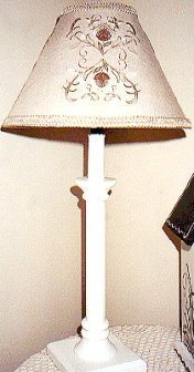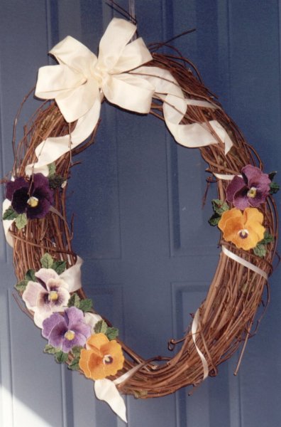 The lampshade uses a design from the PSW library. I changed some of The pansies on this wreath are from Elsa Goussard. They are 3D and are a free the fills to a step satin stitch, and mirrored the design and placed one on download from her site. They were a lot of fun to make. top of another. There are 3 of these going around the lampshade.