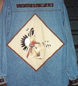 I embroidered the back of this denim shirt to look like a garden. I used This is my Indian jacket. I embroidered Emnet's NA Indian onto fabric then I Brother cards 31 and 47. I used decorative stitches to fill in areas around appliquéd this onto the jacket. The designs on the cuffs & yoke are from Balboa. On the flowers. The bee was downloaded from the internet. front is the buffalo from Brother card 30 & other designs from the same Balboa pack.