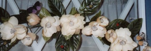 A purchased swag that I embroidered ladybugs and bees on. The butterflies are freebies from Hatched in Africa, they were embroidered on organza, cut out & glued to wire. Click here to download ladybug.